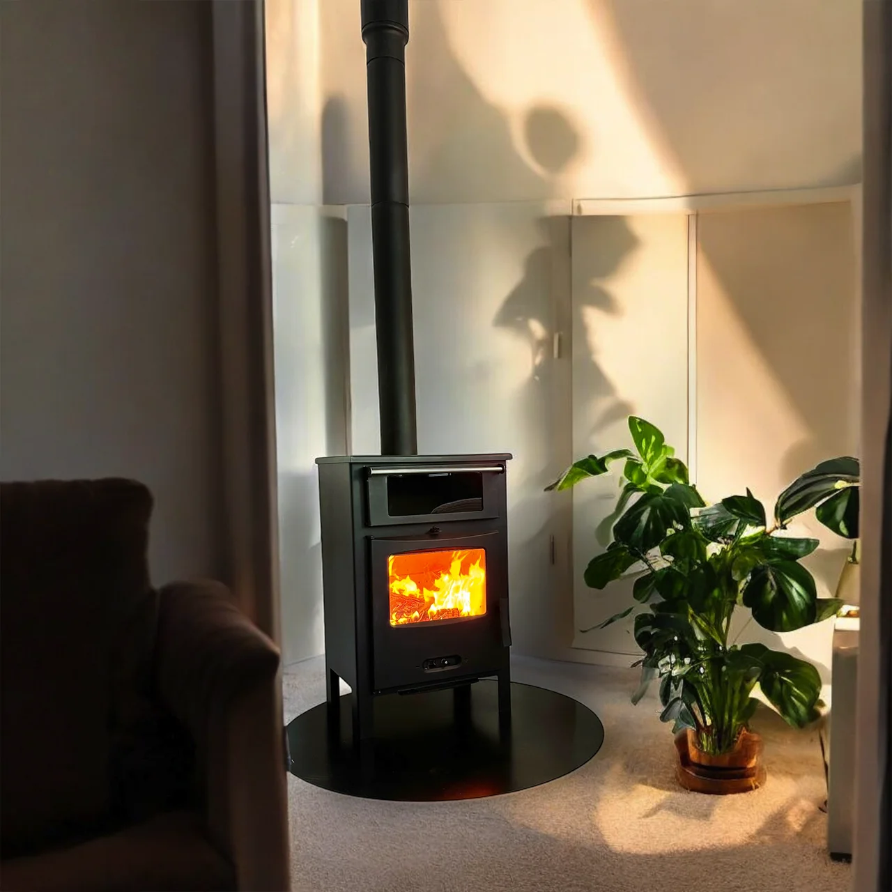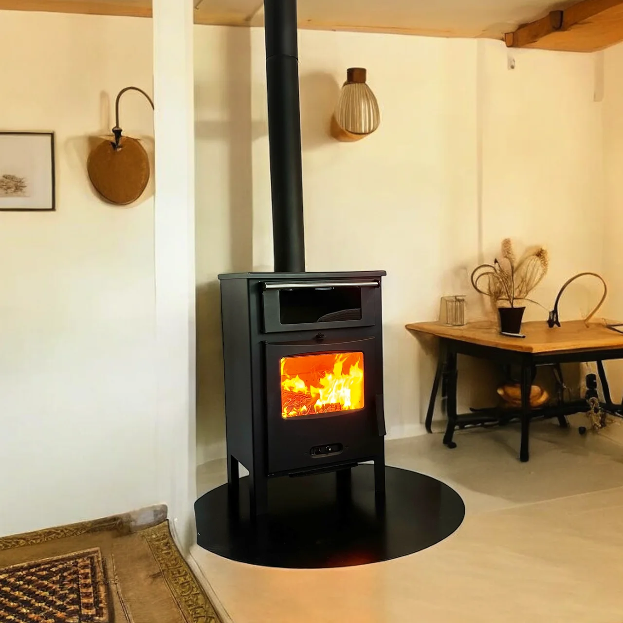 👁️ Система «чисте скло» забезпечує огляд полум’я, а чавунні дверцята підвищують надійність конструкції. Верхнє підключення до димоходу дозволяє швидко інтегрувати піч у будь-який інтер’єр, а подвійне догорання димових газів покращує ККД і зменшує витрату палива.